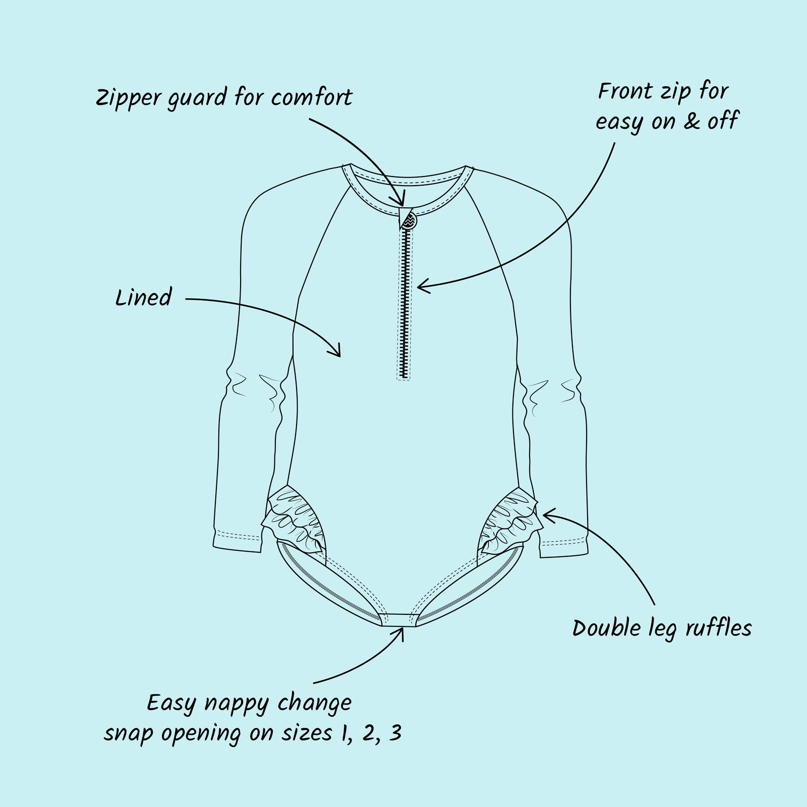 πŸ–οΈParent-approved front zip β†’ easier changes, fewer tears, more time for fun in the sun