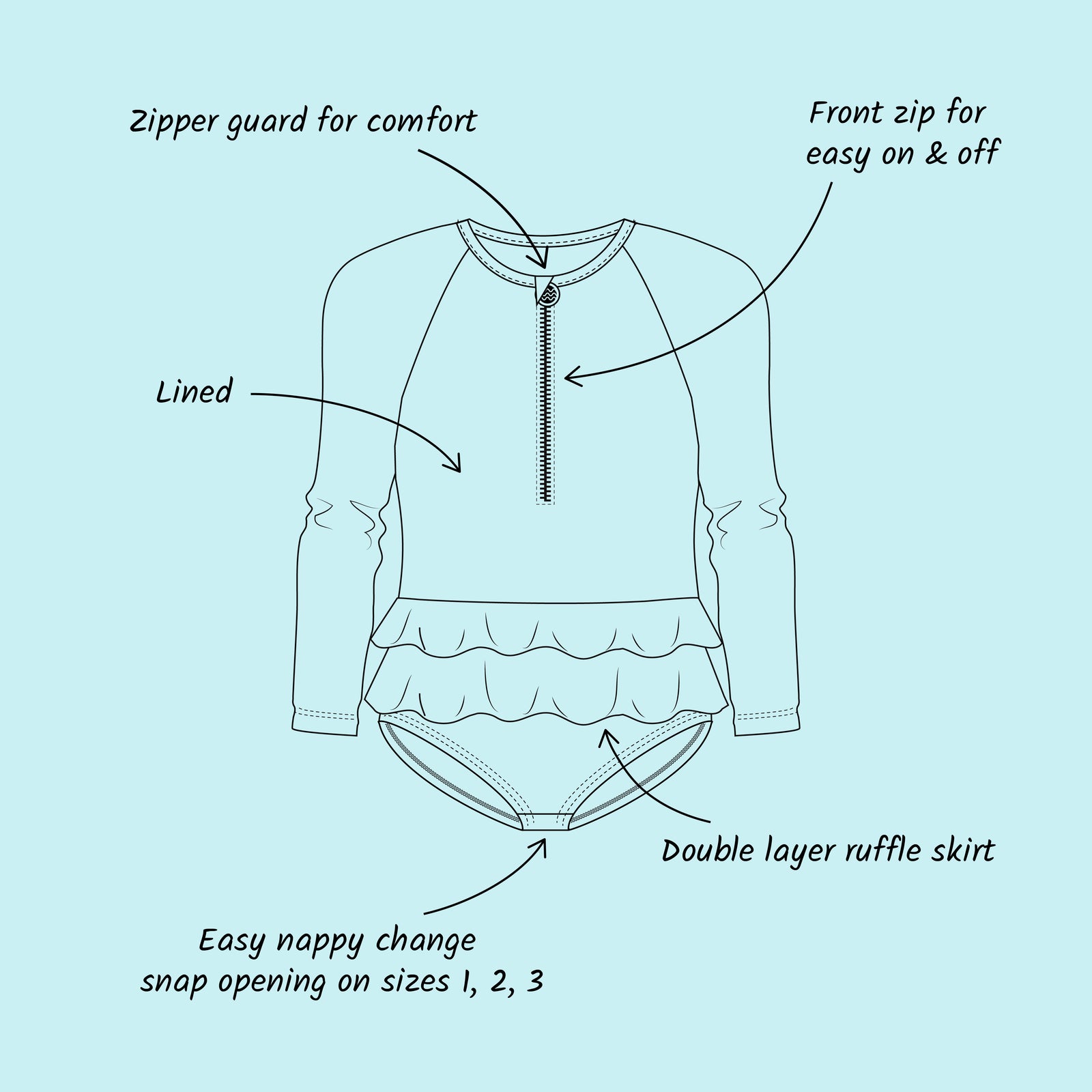 The Millie Surfsuit brings together sun-smart protection and playful design. With UPF 50+ fabric, long sleeves, and a high neckline, it keeps delicate skin covered while chlorine-resistant material ensures colours stay bright all season. The front zip makes it a breeze to get on, while the zipper guard keeps it comfortable to wear. With a skirt made for twirling this surfsuit is designed for all-day fun in the sun!